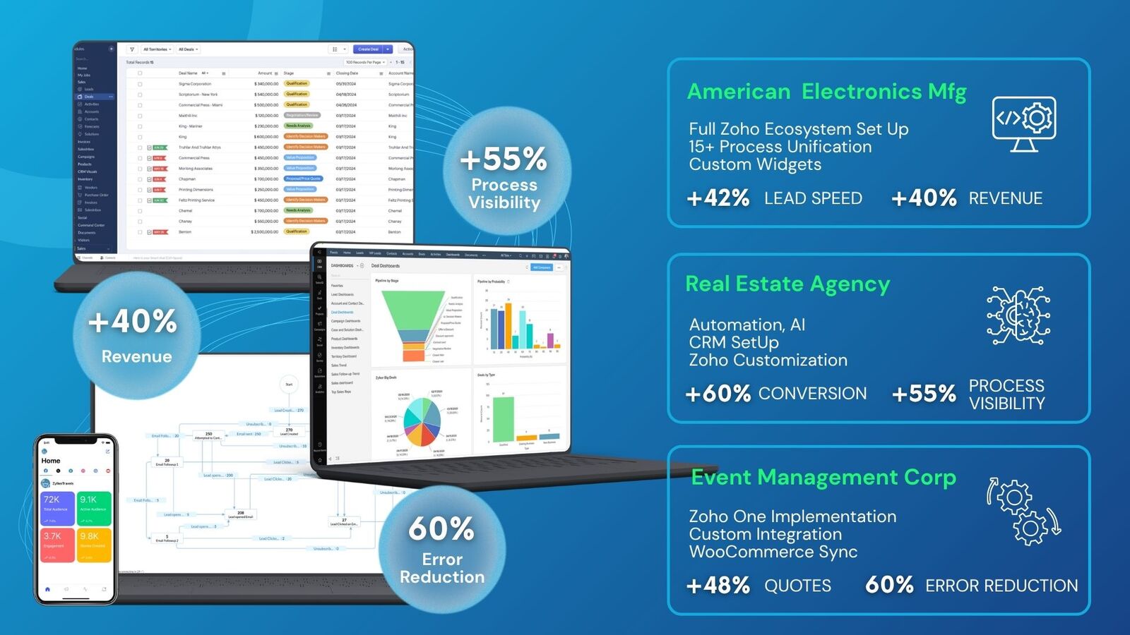 АвтоматизаціяCRM вирішує саме цю проблему. А Zoho CRM один із найпотужніших інструментів для її реалізації, який не вимагає залучення жодного розробника.