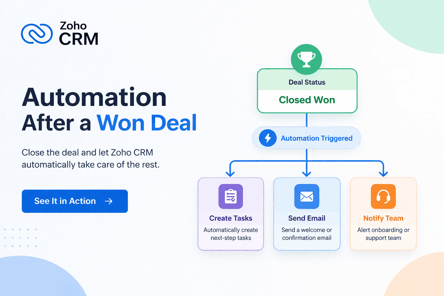 Одна кнопка — одразу кілька дій. Менеджер натискає «Надіслати пропозицію», і ZohoCRM автоматично надсилає електронний лист за шаблоном, оновлює статус угоди, створює завдання для подальшого супроводу та реєструє цю дію. П’ять ручних кроків замінено одним.