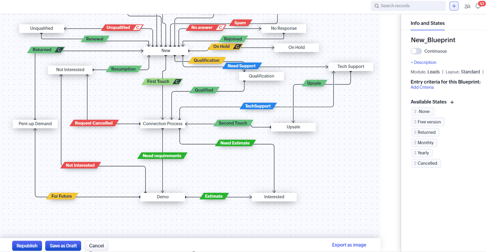 Blueprint — це більш просунутий інструмент. Він дозволяє скласти чіткий план для кожного етапу конвеєра: що має зробити менеджер, перш ніж угода перейде на наступний етап, які поля є обов’язковими для заповнення, хто повинен затвердити перехід.